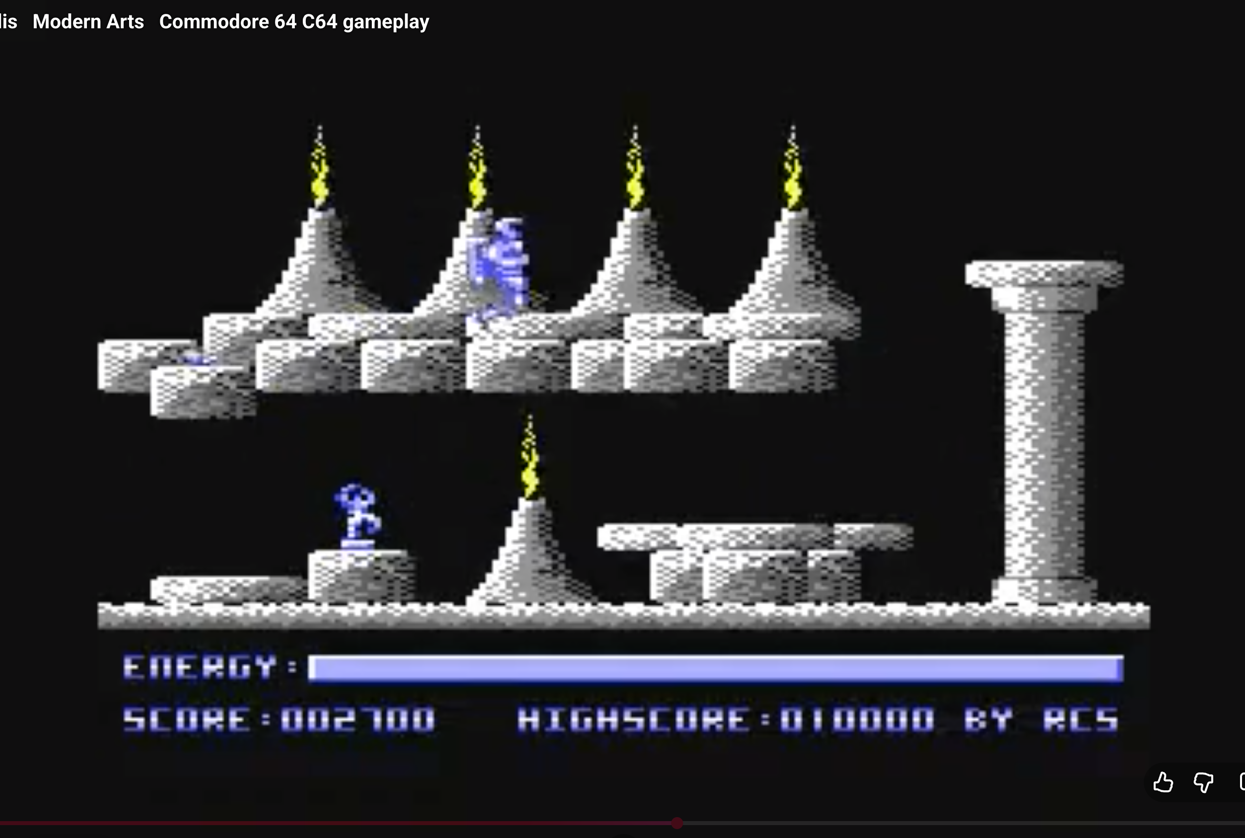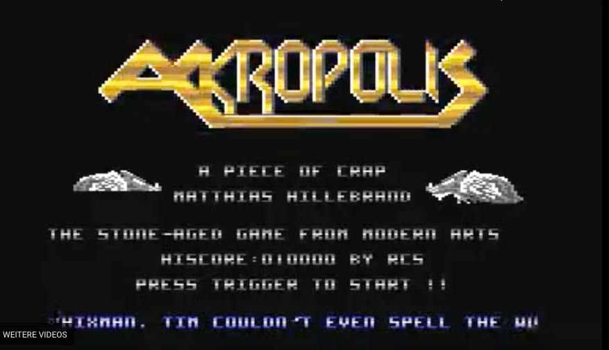 Akropolis is a C64 Shoot-em-up developed by Matthias Hillebrand and Tim Kleinert. Tim Kleinert created the music and art, and the programming was done by Matthias Hillebrand in 1989. They published it under the name Modern Arts, which was the name of their demoscene group at the time. Ironically, the two developers referred to their game as ‘a piece of crap’ and a ‘stone-age game’ in the title screen.