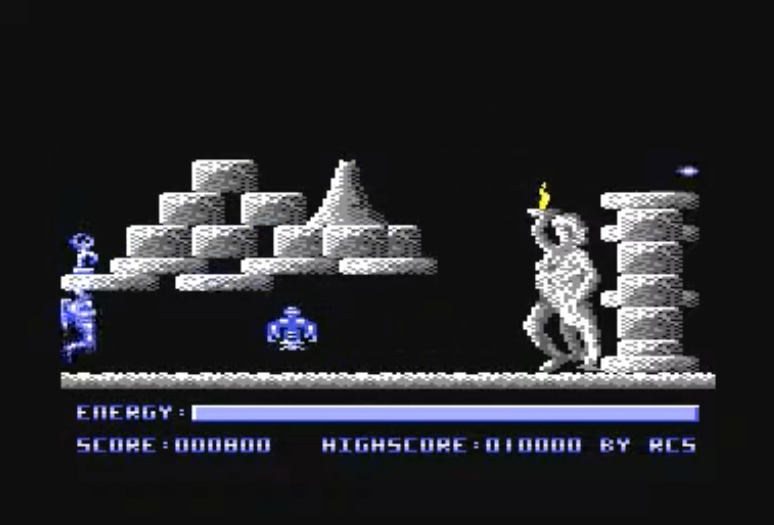 Akropolis is a horizontally scrolling shooter. Your hero avatar is a jet-pack-equipped fighter who must fight their way past numerous flying and bouncing threats of the ancient world to make their way to the heart of the Akropolis and gather the statues hidden around to win the game. Akropolis was published in Italy with the title „Ancient World“ in the C64 game collection of Formula 64, number 71.
