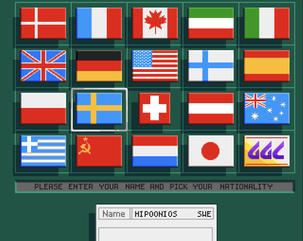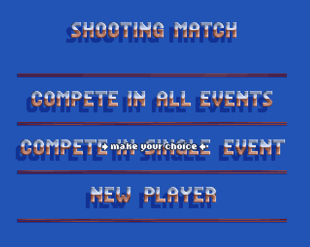 The objective of the game is to control a crosshair and shoot at moving targets or obstacles across five levels. The title screen features detailed artwork of a gun, which makes sense, since during gameplay the player only sees the crosshair on the screen. Next, the player chooses a national flag and enters a name. Not all countries are available, but options include Switzerland, Japan, and the flag of the former Soviet Union. Interestingly, the Swiss flag is placed right in the center—whether this is a coincidence remains unclear.