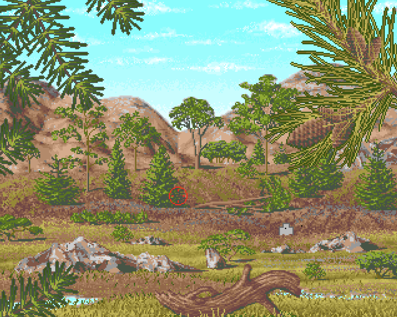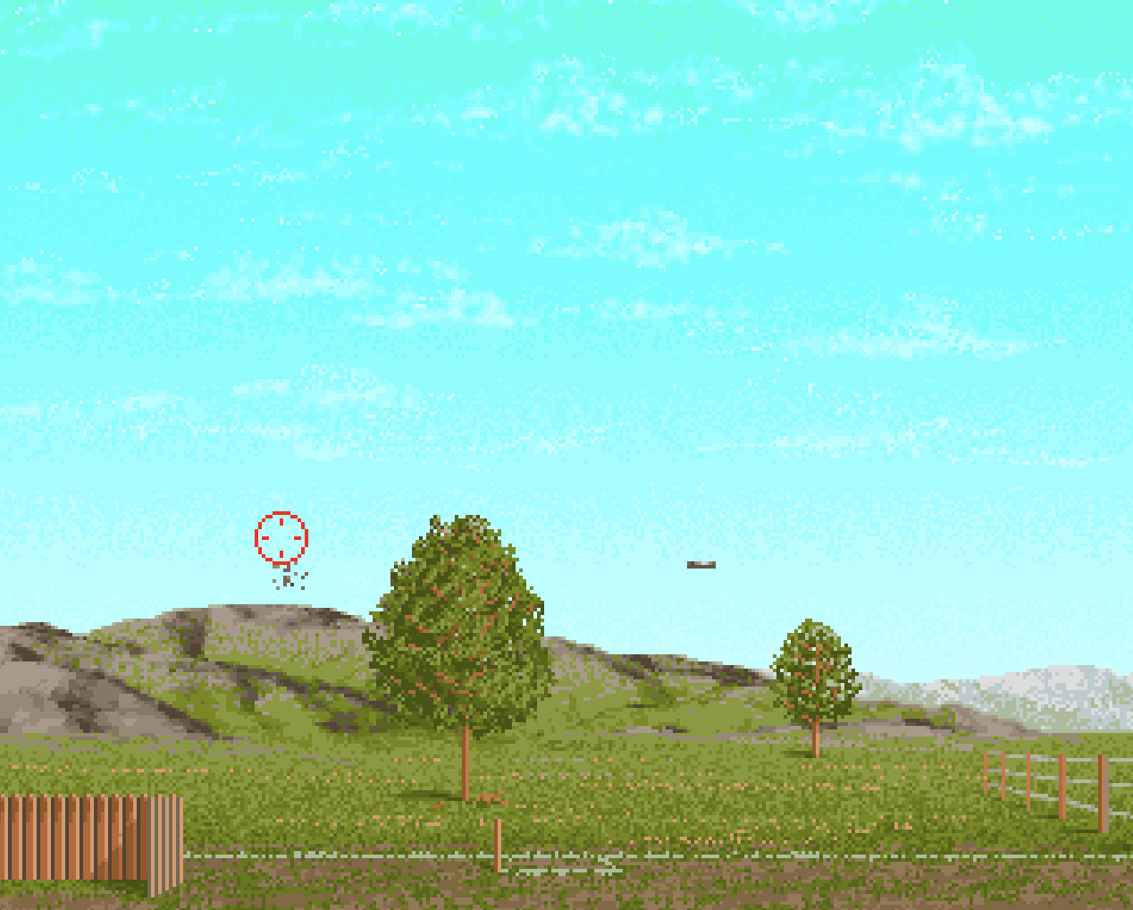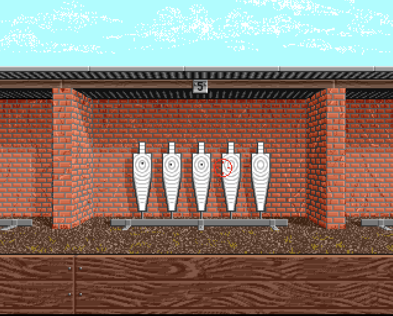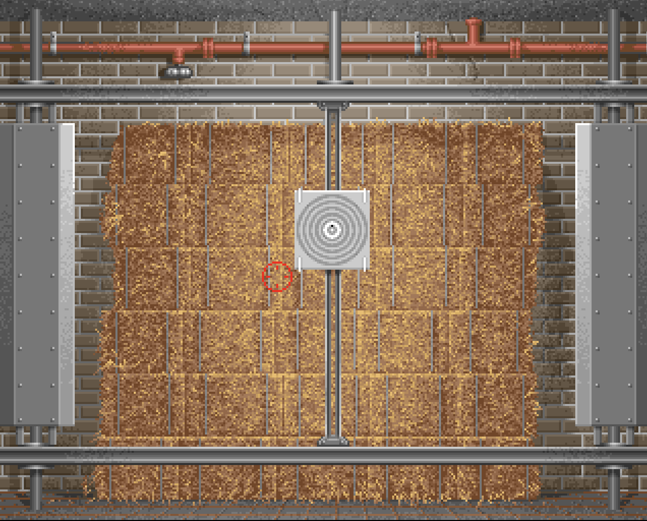 The levels depict scenes reminiscent of a shooting range. Notable visual elements include brick walls and hay bales in the background. Two of the levels take place in outdoor environments; in one of them, the player shoots clay pigeons. At the end of the game, players can enter their name into the Hall of Fame.
