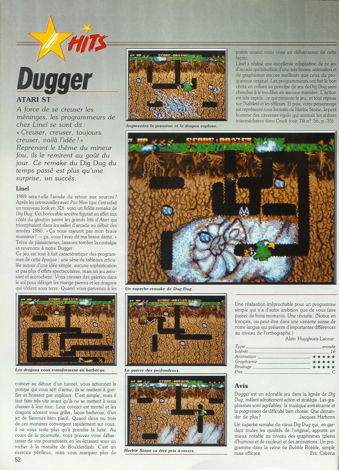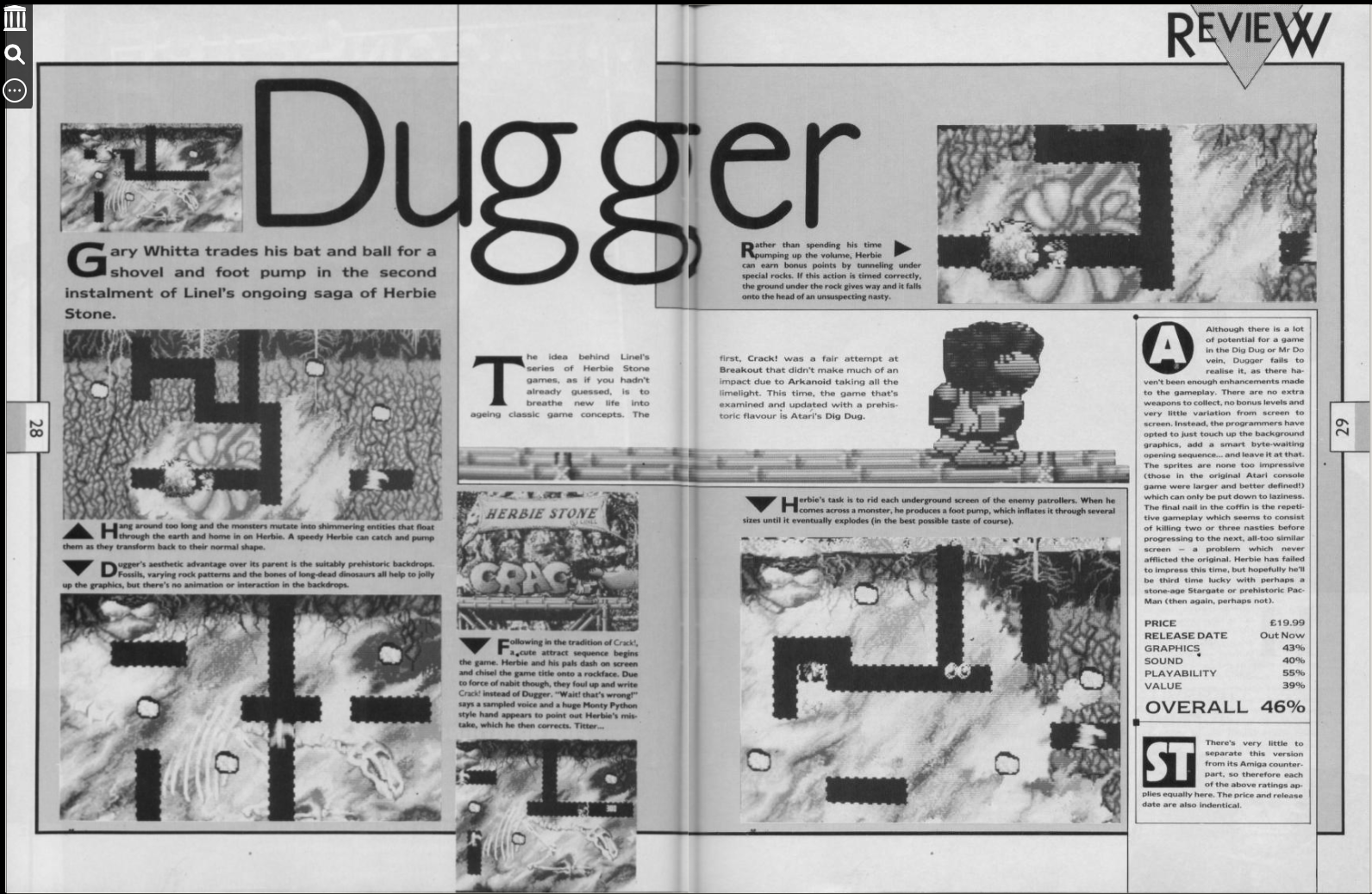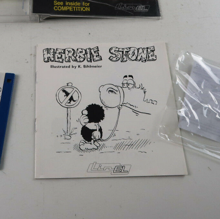 The game's box art was created by Herman Serrano. The booklet featured a comic by Karl Bihlmeier, a German cartoonist from Cologne who later got reasonably famous with his “Hermann, der User” Computer cartoons, that were published in Amiga magazines and many other publications. The colorful in-game graphics of prehistoric Herbie Stone were developed by Roland Petermann. Herbie Stone is a stone age human that has some everyday problems. He became the main character of the two Linel games Crack (1988) and Dugger (1988). The booklet shows Herbie's problems as funnies, short cartoons in one, two, three or more panels. Illustrations are done by Karl Bihlmeier. The cover page shows Herbie with his domestic dragon on a leash wondering about a sign that says, no dinosaurs allowed beyond this point. The funnies and the “Big Dugger Competition” did serve marketing purposes.