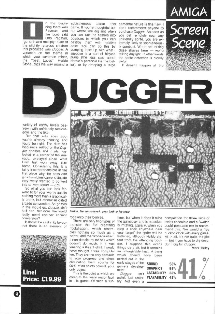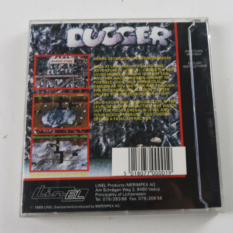 Dugger was the second game of a series of three games with a prehistoric theme around the character Herbie Stone. However, the third game with the working title Dugger 2 was never finished. The first game of the series was Linel's Breakout variant Crack, which was released earlier in 1988. In fact, the two games share almost the same intro sequence, the only difference is, that Dugger's intro sequence contains inside jokes that build on the humour of Crack's intro.