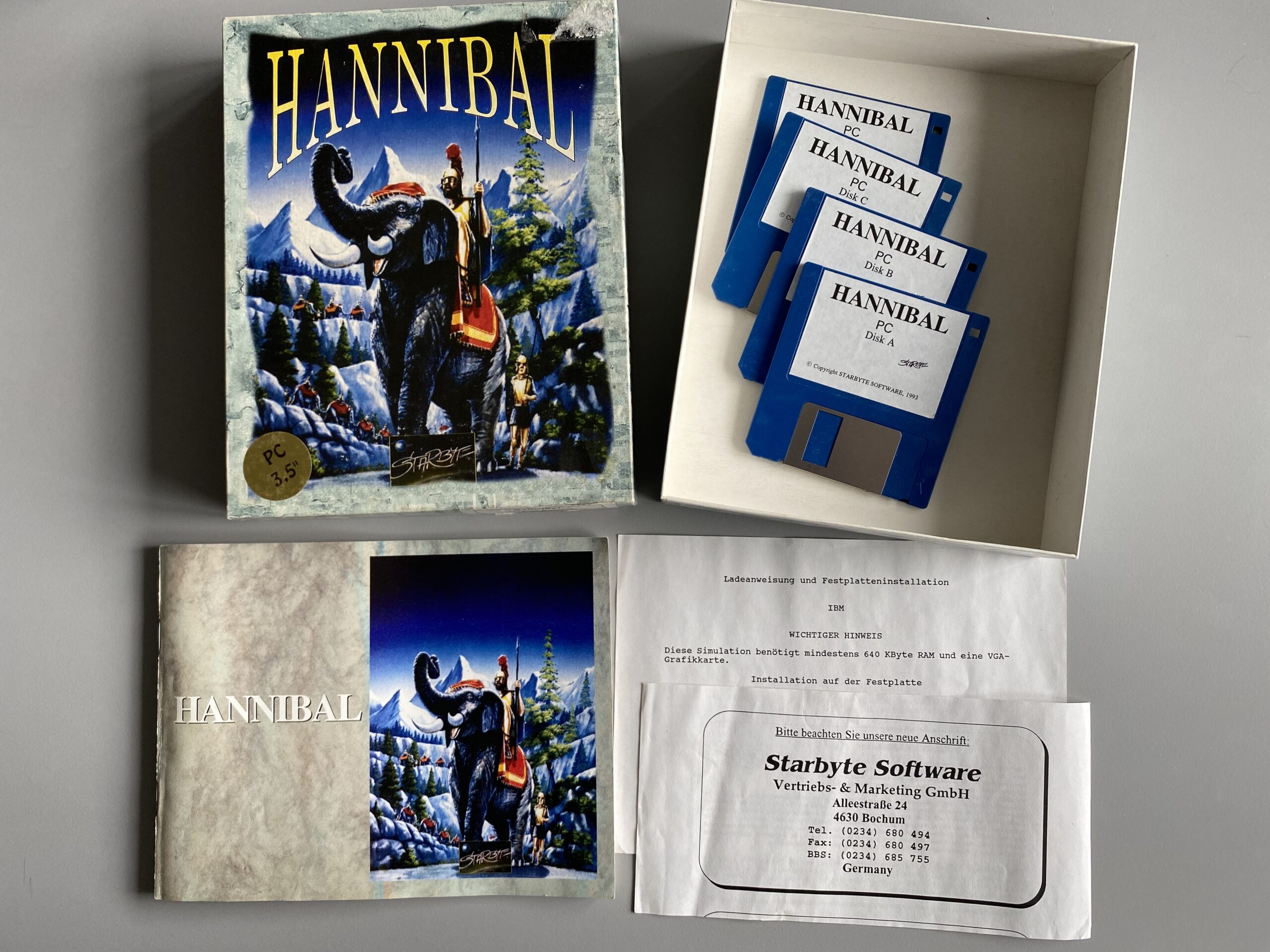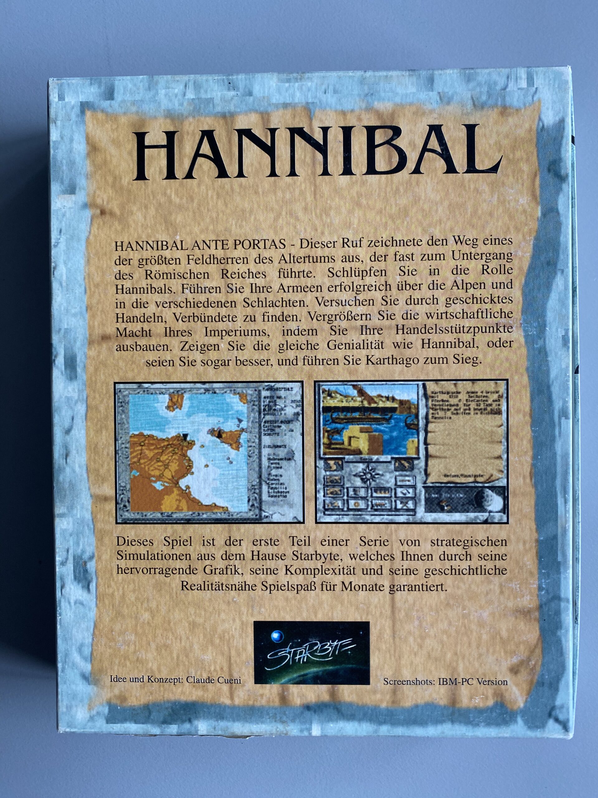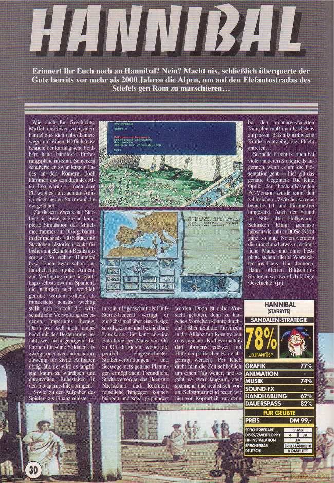 Hannibal was in development since 1989. The historical strategy game was produced by the Swiss production team Blackpencil and published by Starbyte Software in 1993. There were four releases: Amiga 1993, DOS Germany 1993, DOS USA 1993 by Micro League Multimedia Inc., and DOS USA 1995 by General Admission Software. Hannibal's PC version was popular in the USA where it was often subtitled as “Master of the Beast” and may still be considered a cult game. Loading time was long on the Amiga; the DOS version worked better, according to player comments, but was not as organized. There were also a couple of diskmag versions in 1994 and 1995.