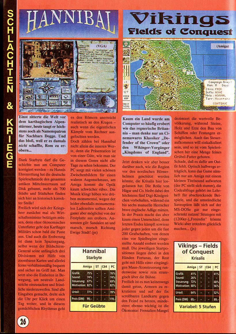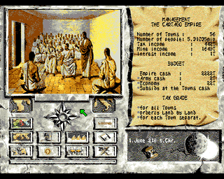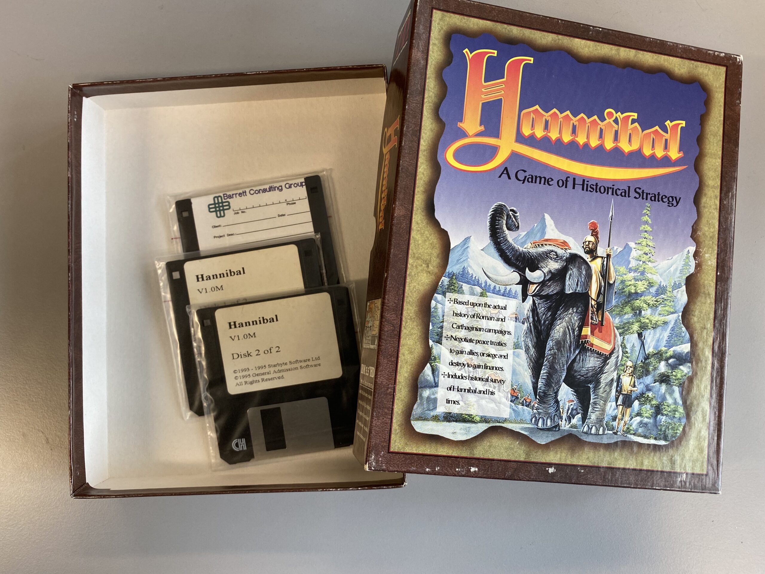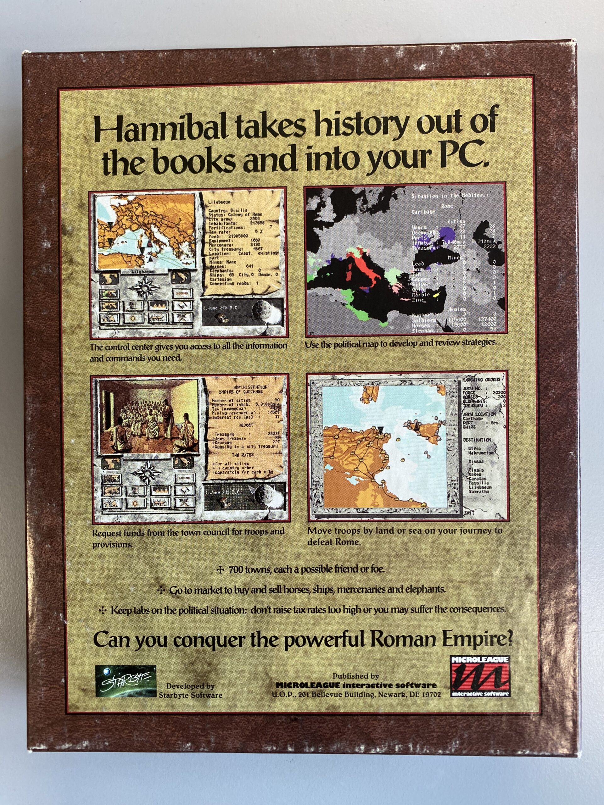Hannibal was in development since 1989. The historical strategy game was produced by the Swiss production team Blackpencil and published by Starbyte Software in 1993. There were four releases: Amiga 1993, DOS Germany 1993, DOS USA 1993 by Micro League Multimedia Inc., and DOS USA 1995 by General Admission Software. Hannibal's PC version was popular in the USA where it was often subtitled as “Master of the Beast” and may still be considered a cult game. Loading time was long on the Amiga; the DOS version worked better, according to player comments, but was not as organized. There were also a couple of diskmag versions in 1994 and 1995.