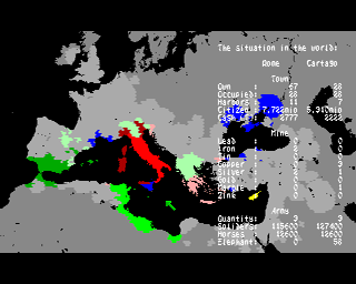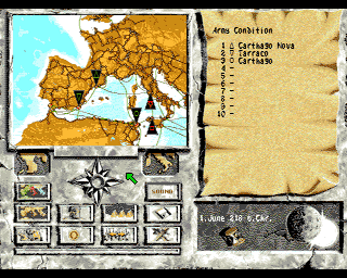 Cueni describes Hannibal as a historical trade and war simulation that is based on the Second Punic War (218-201 BC). It features 756 historical cities with cultivated areas and population figures according to the studies of Professor Karl Julius Alwin Beloch (1854-1929). The game came in a large cardboard box with artwork, six 3.5-inch floppy disks, and a printed booklet (for DOS and Amiga) that included an instruction manual. The booklet has 48 pages with two columns per page and a colorful, illustrative picture of Hannibal’s elephants traversing the snowy alpine mountains. The manual explains mousecontrol and GUI first, with instructions on how to play. And this is followed by a description of Carthago and the Punic Wars. Explanations of historical battle tactics follow on the next pages, where the individual battle formations are depicted by means of diagrams. A CH-Ludens blog text by Beat Suter offers a more detailed description of Hannibal's booklet.
