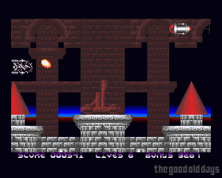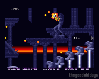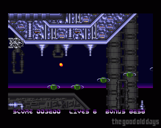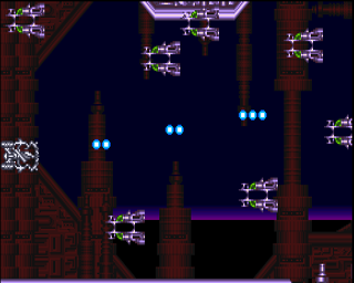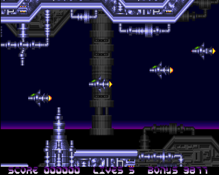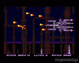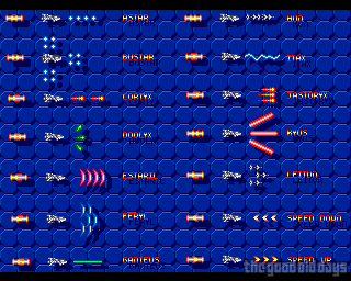At the end, you must enter Arkhon's fortress and destroy the generator of an infernal time machine. En route, you have the opportunity to obtain 14 power-ups, such as Speed Down/Up, as well as several types of improvements for your shot. The most effective of these are the triple triggers Bustar, Doolyx, Jaxtorys, Leitun and Kyus. At the end of each stage, you will encounter gigantic final bosses with enormous sprites that require many shots to defeat. Ilyad has a great soundtrack that is very effective.