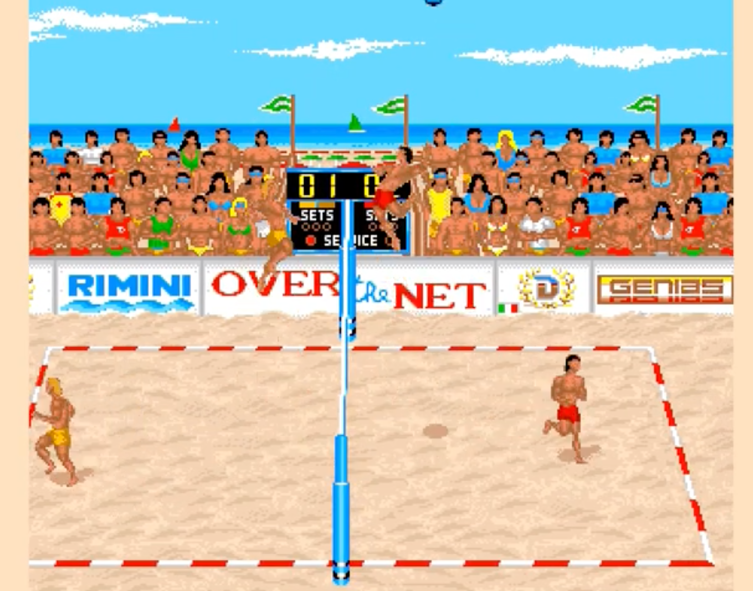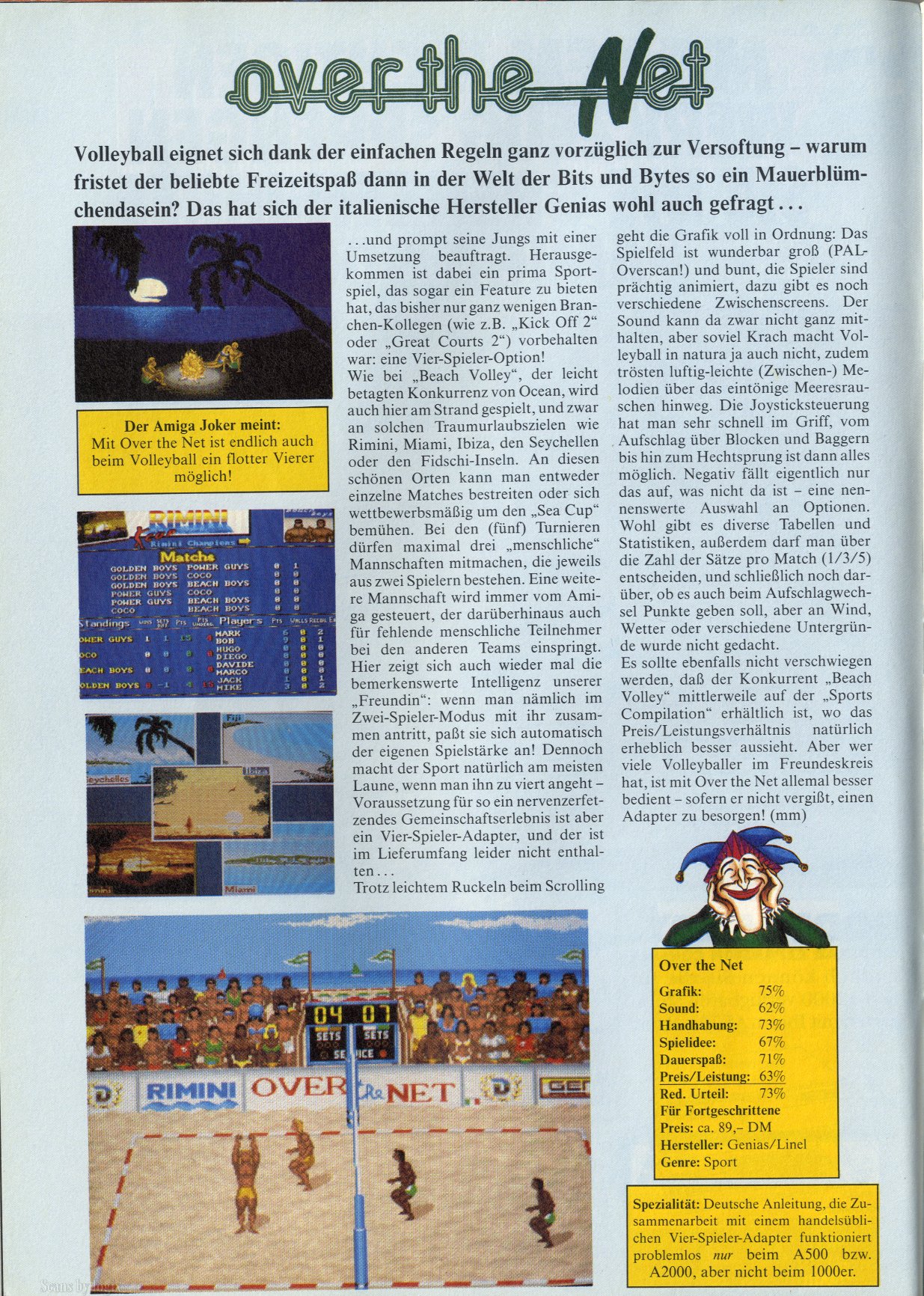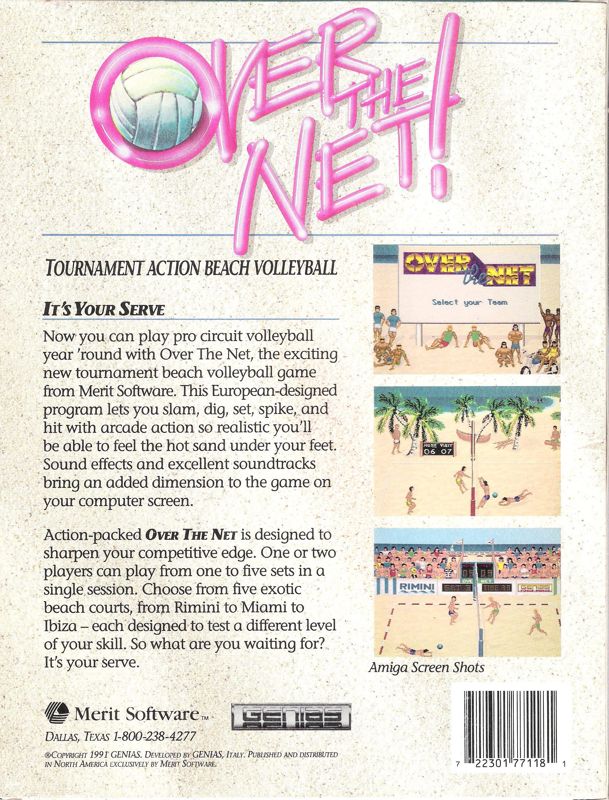 Over the Net (1990) was developed by Genias in cooperation with Linel and published by Merit Software. The original Amiga version was created by the Dardari Brothers on Amiga. The game was ported to C64 and DOS in 1991. It is an arcade-style volleyball game for the Amiga. Players can choose to play matches of 1, 3 or 5 sets, with each set won by the first team to score 15 points. The game features a variety of teams, including the Rollers, CoCo, the Beach Boys (a playful pun) and the in-house Geniases. The volleyball players look a bit like bodybuilders, wearing shorts and no shirts. As some said at the time, it was the ultimate beach volleyball gaming experience designed for the Amiga 500.