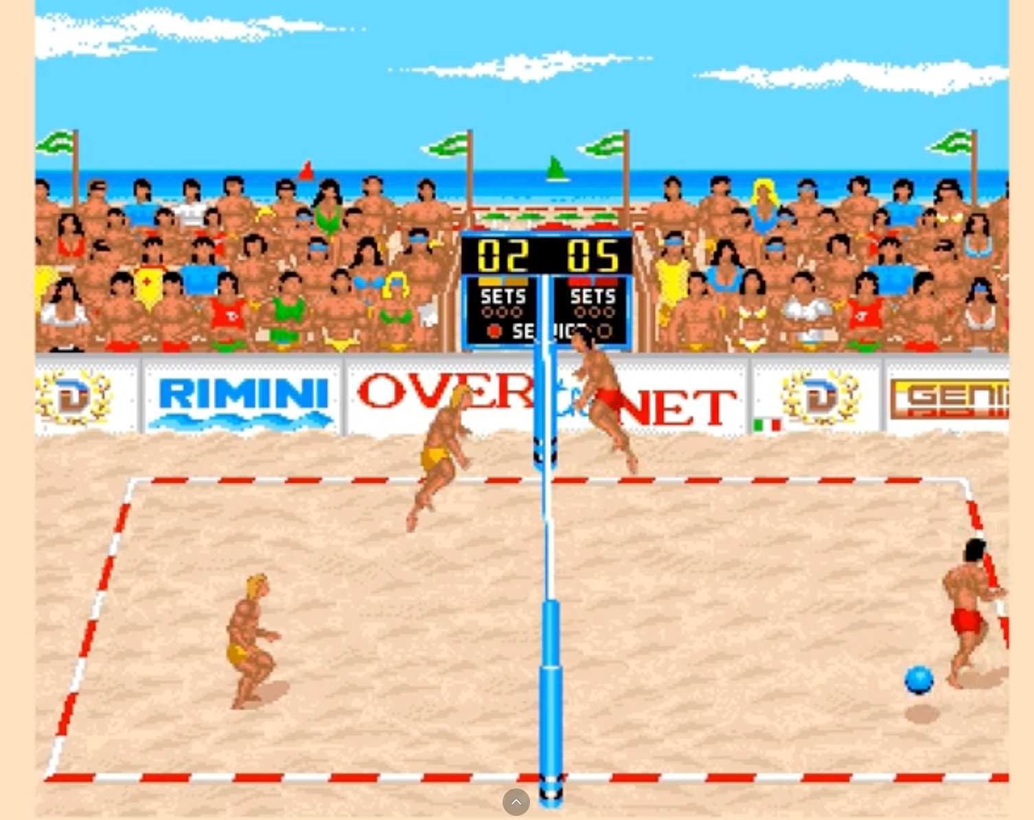 The game is viewed from the side, giving a full view of the volleyball court. The stands in the background are filled with spectators, tanned, beautiful beachgoers. The score is shown on a digital display in the middle of the stands. You hear the constant sound of the waves in the background. Players control their characters by moving the joystick, and the fire button lets them try to hit the ball in the direction they're moving. Like in real volleyball, you lose points if the ball hits the ground on your side or goes out of bounds without bouncing. You can compete against friends or the AI in intense matches across various exotic beach locations. You can serve, spike, and block your way to victory as you master the art of the game. With different player characters to choose from, each with unique skills and attributes, every match brings new challenges and strategies to explore. The characters can jump high up in the air - up to four meters – for serving or slamming the ball. This comes over as a witty and well-suited element for gameplay.