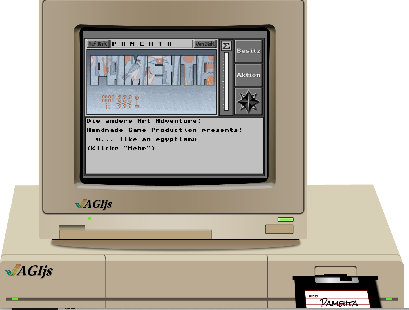 However, it can also be played directly online via this link: agijs.ra-phi.ch. An interpreter called AGI js is provided for this purpose. AGI js is an interpreter written in JavaScript (js). It is capable of playing games that were implemented with AGI (AGI = Adventure Game Interpreter for Amiga) in the browser. This means that the two well-known AMIGA games Pamehta (1989) and Züri (1992) – also by Gressly and Freimann – can be played directly in the browser. AGI1 and AGI3 were developed by Raphael Schweikert.