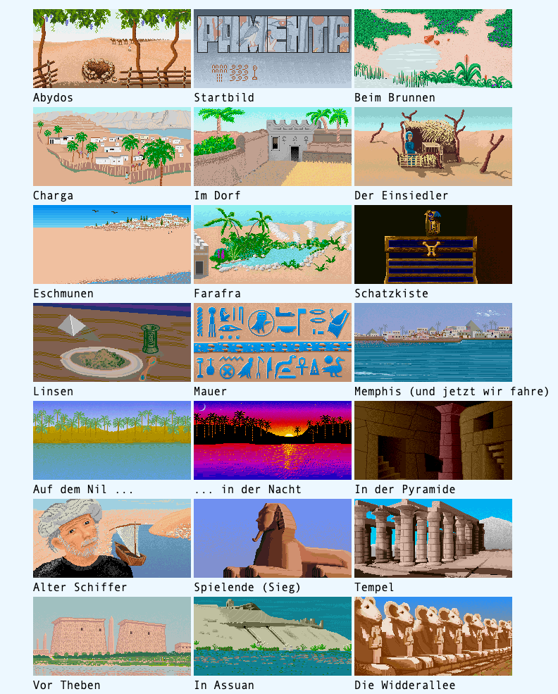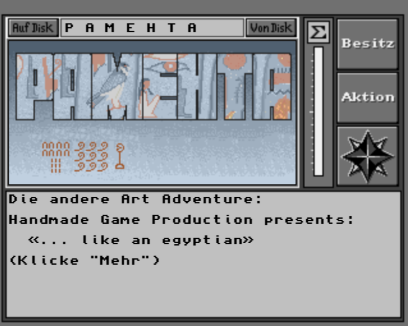 Pametha is an adventure game set in ancient Egypt. As a player, you find yourself in the middle of a strange world. Only with time do you realize that you are suspected of stealing a valuable flute. Now begins a journey through the land of the Nile 3,500 years ago. On the website, Philip Gressly writes: “Pamehta was my first major computer game. I sacrificed three months of my semester break to work on it, which put me a little behind in my math studies ;-( ... but I made up for it in my computer science studies. I learned a lot about game programming and Egypt in the process.” The game was originally developed for the Amiga operating system. Gressly and Freimann still run a website today where a download for Amiga emulator is offered.
