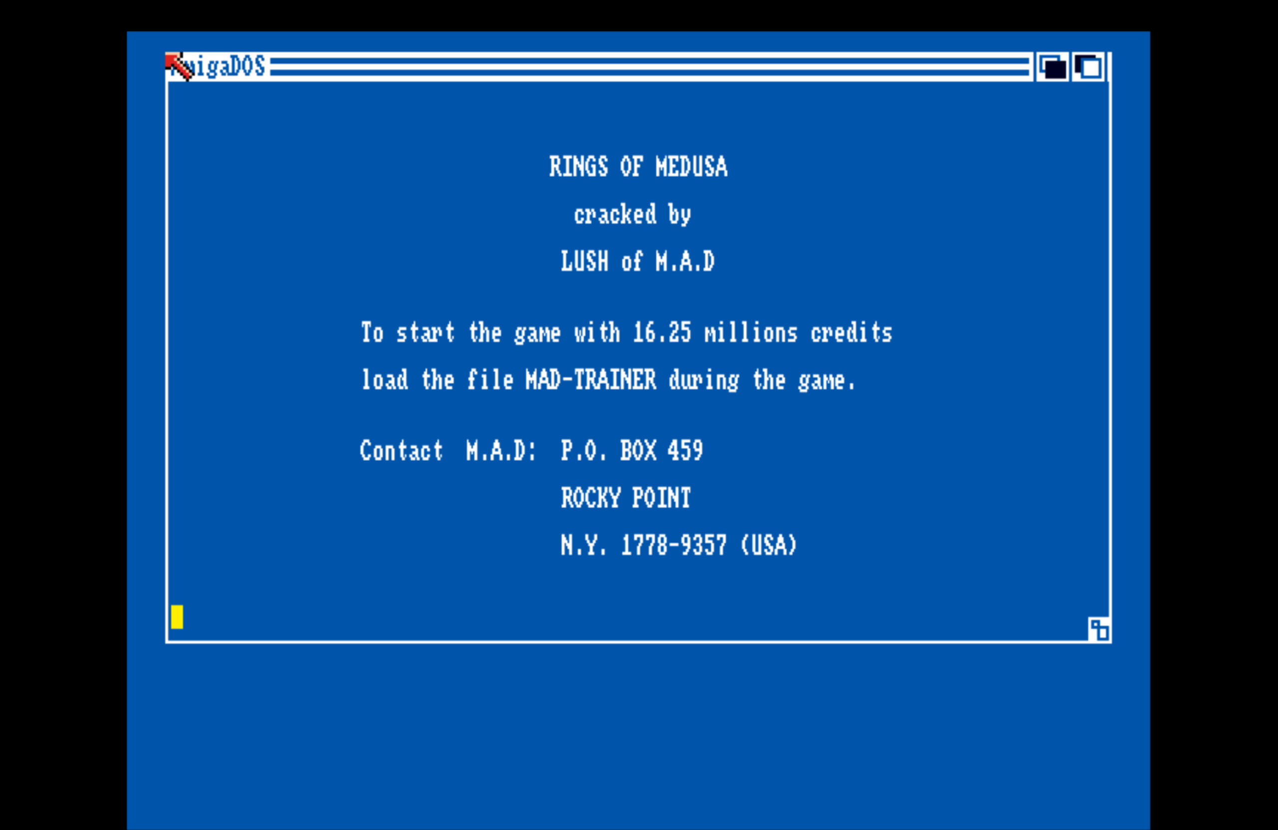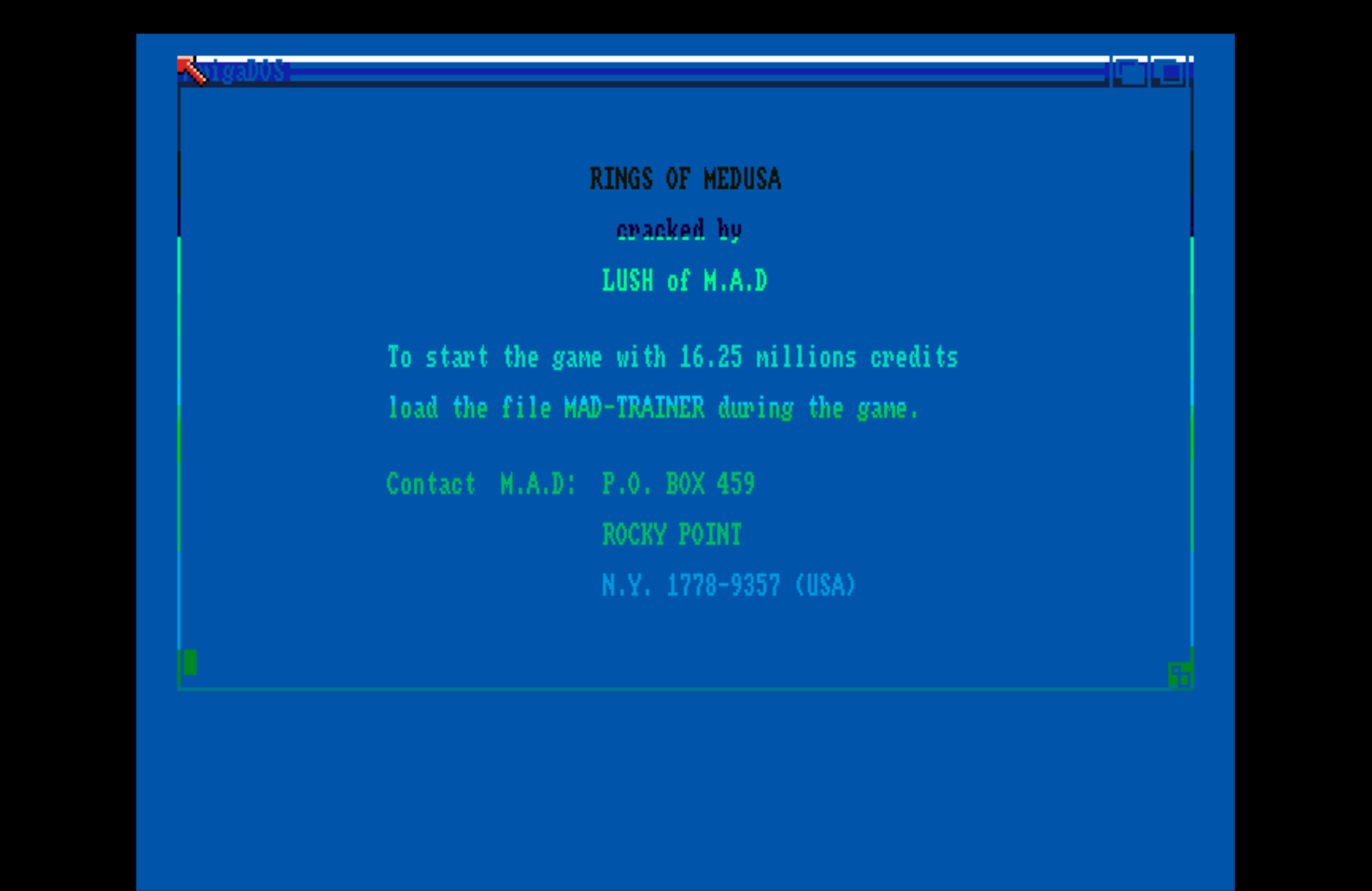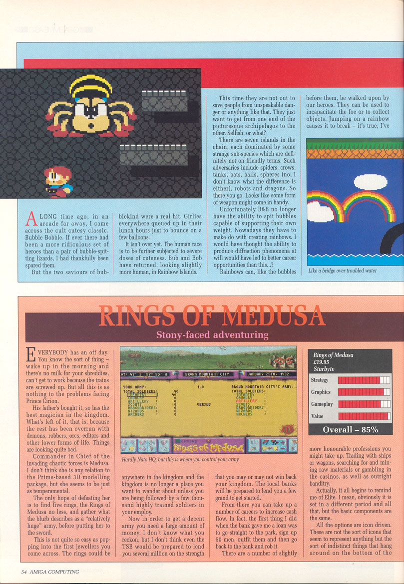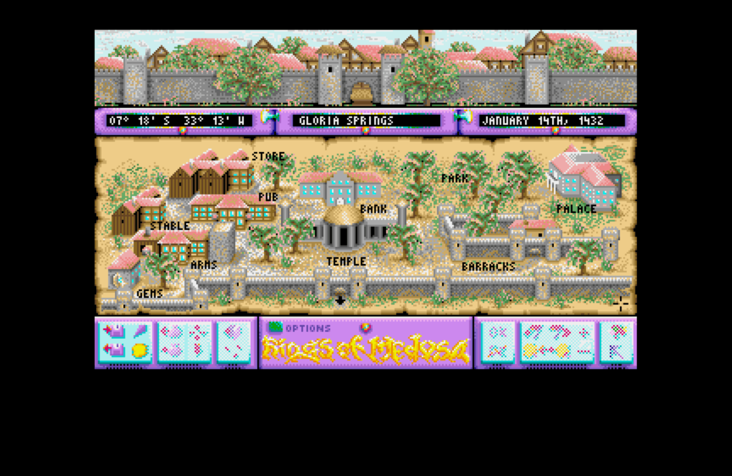 Rings of Medusa (also known as ROM) is a mixture of strategy, role-playing, and economic simulation. It was the first game published by Starbyte Software. The Amiga version was programmed by Christian A. Weber and Christian Haller. The original concept and design was done by Tillmann Bubeck on Atari ST. The game was released for Amiga, Atari ST, Commodore 64, and MS-DOS in single-player mode.
