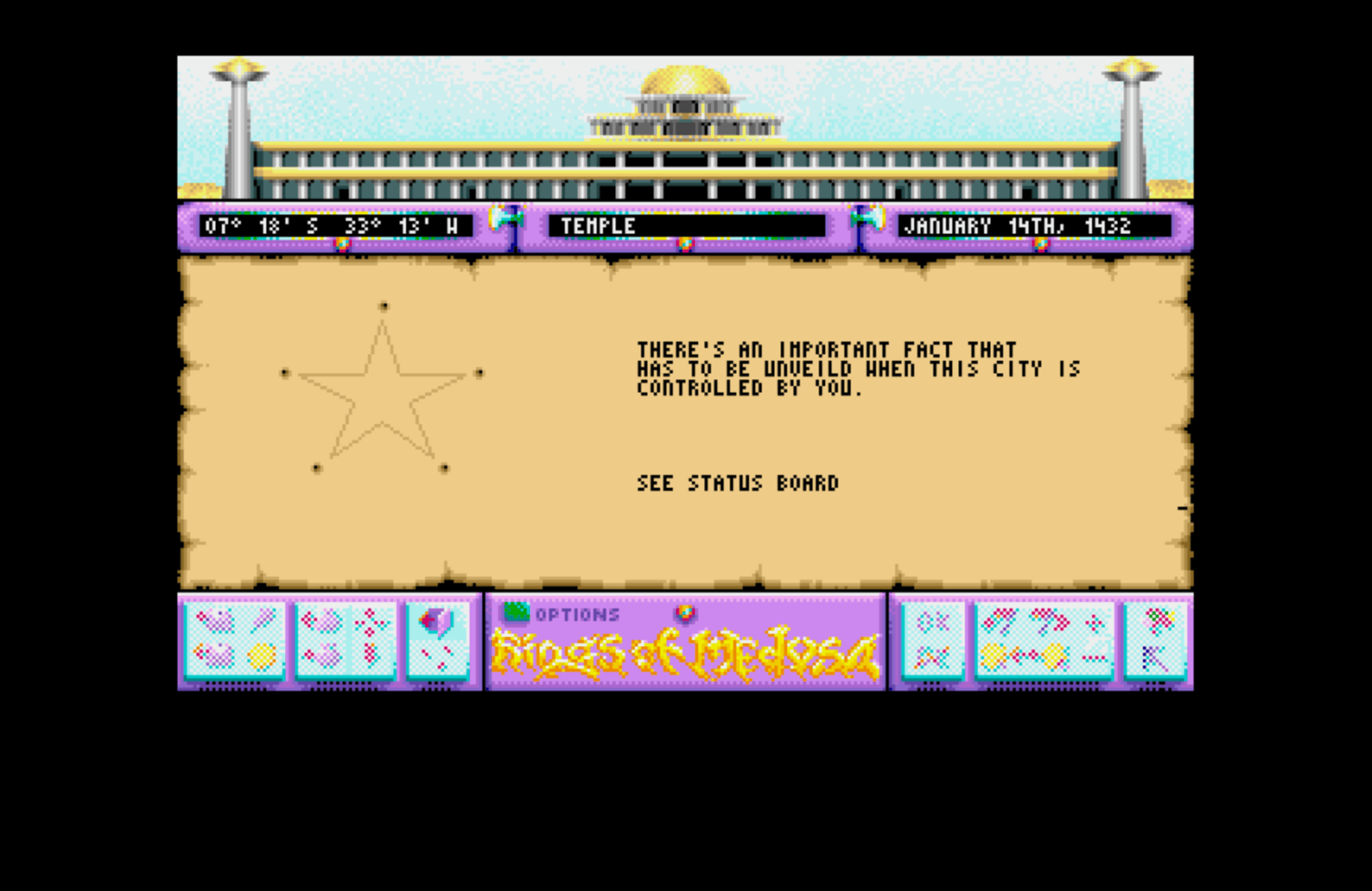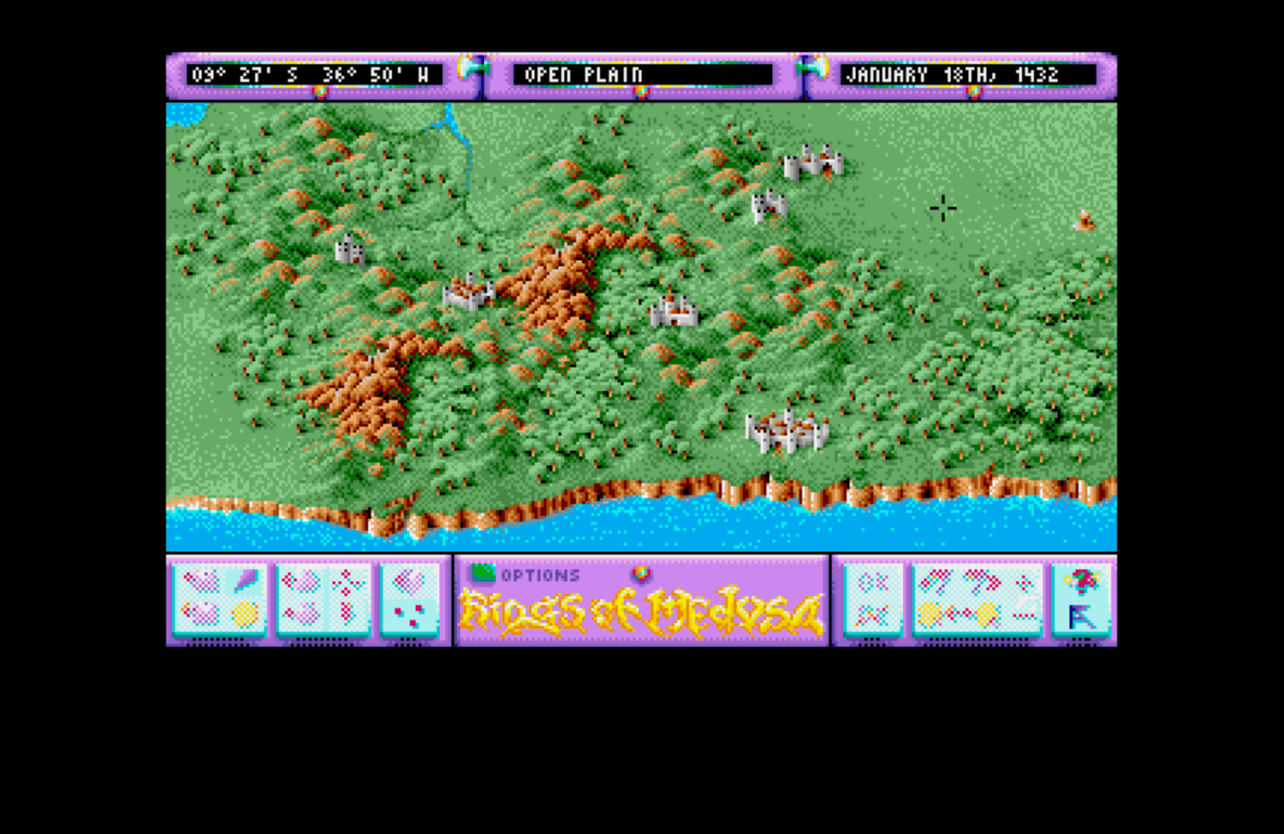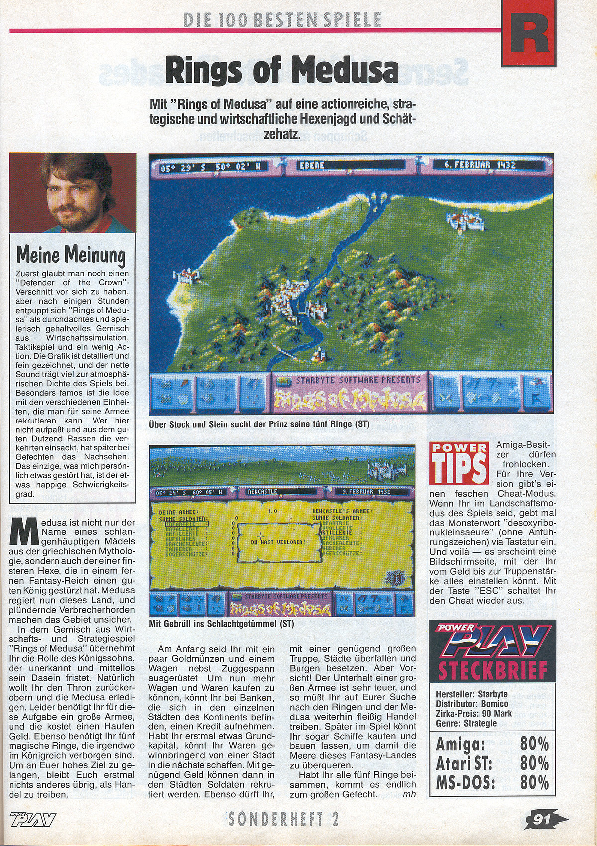 Perception This game was released for Atari ST, Amiga, PC, and C-64, with the Amiga and Atari versions based on the same source code. It received a rating of 75% in the game magazine Amiga Joker with the conclusion ”an absolute must for all strategy enthusiasts!" Rings of Medusa was very popular and remained number one in the game charts in Germany for six consecutive months.
