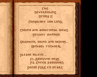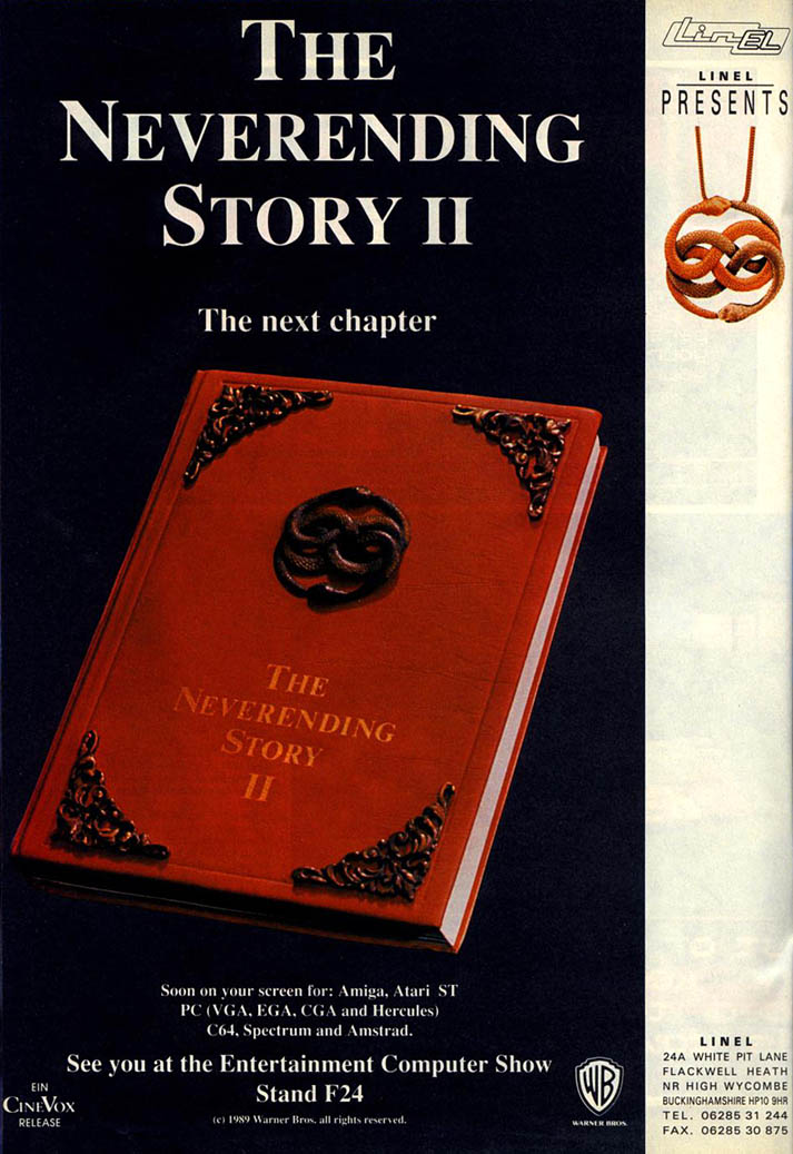 The release of Neverending Story II: the Arcade Game in early 1991 in German on Commodore 64 was followed by Amiga, Atari ST and PC versions in French, Italian and English and Spanish.In the Italian version Andy Routledge was involved for storyboard and Emilia Urso for text translation.