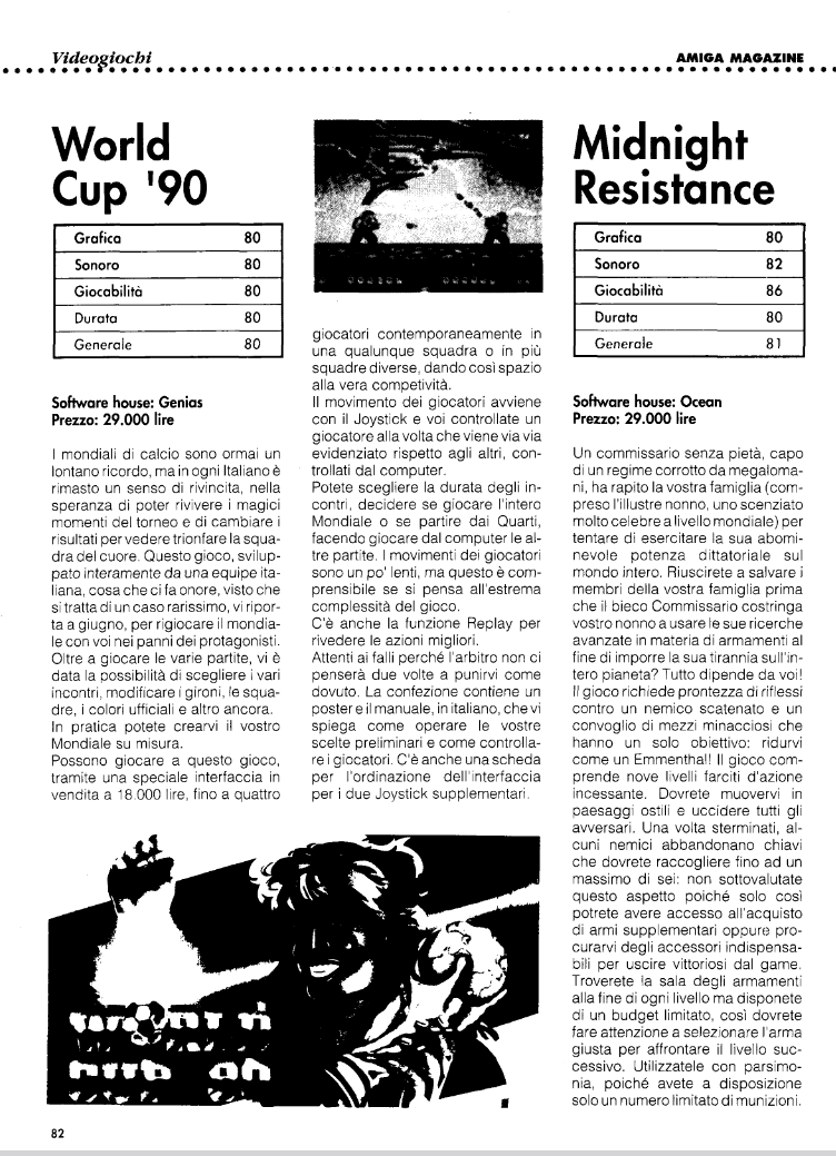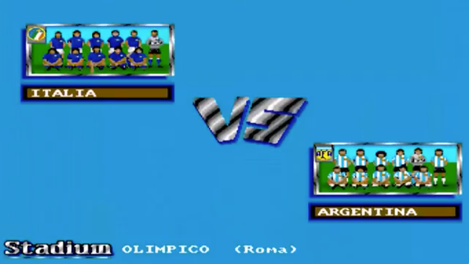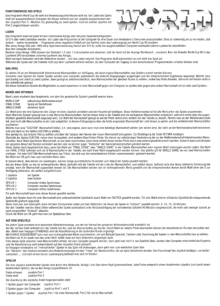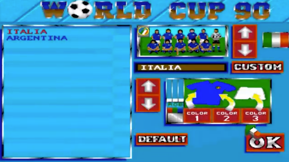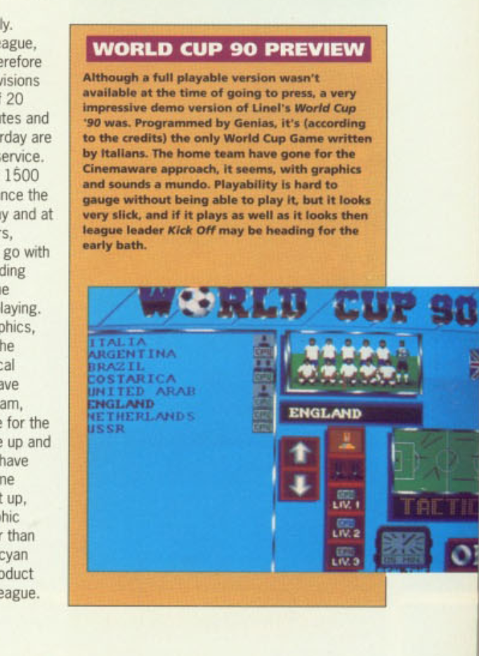 World Cup 90 is a football game based on the 1990 World Cup in Italy. All of the 24 national teams that participated in the tournament are included. However, due to a lack of licensing, the players' names are fictional. Players can create custom teams and change their names, tactics and the colour of their jerseys, as well as editing the team's line-up. There is a two-player mode (1 vs. 1 or 2 vs. CPU) and, through an additional interface, it is possible to add two more players.