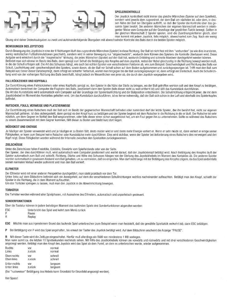 “Heading, bicycle kicks, penalty kicks, and even fouls are no problem with this top-notch soccer simulation. 1-8 players can participate in this breathtaking game. Two players can play against each other or together on one team against the computer”, advertises the back of the game sleeve.
